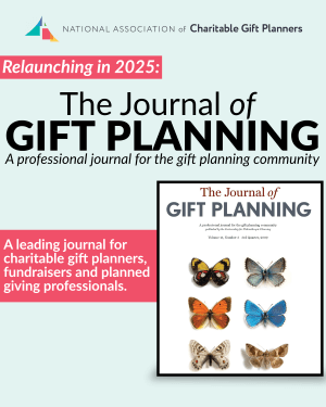 The National Association of Charitable Gift Planners’ (CGP) The Journal of Gift Planning is a leading journal for charitable gift planners, fundraisers, and planned giving professionals. With a thousands-strong community, CGP is uniquely positioned within the field of charitable giving to continue serving as both a professional hub and trusted source for industry-leading programming, continuing education materials, research, and advocacy information. For more than three decades, CGP has provided resources to improve the practice of philanthropic planning and increase the impact of gift planning professionals and charitable organizations.